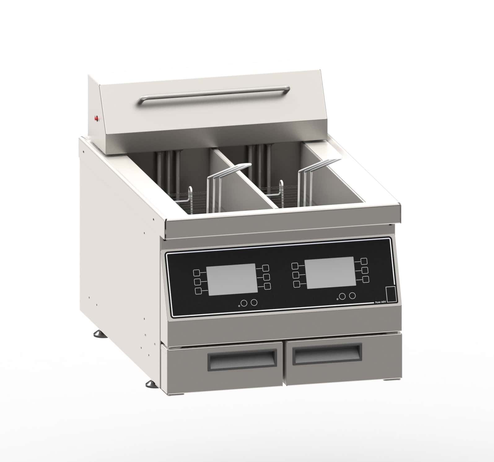 Ud over de konstruktionsmæssige forbedringer har vi også opdateret friturens styring og elektronik for at sikre et lavere strømforbrug og en bedre fritering via bedre temperaturregulering, samt tilføjet en række nye features, som vil gøre brugen af FKI FR